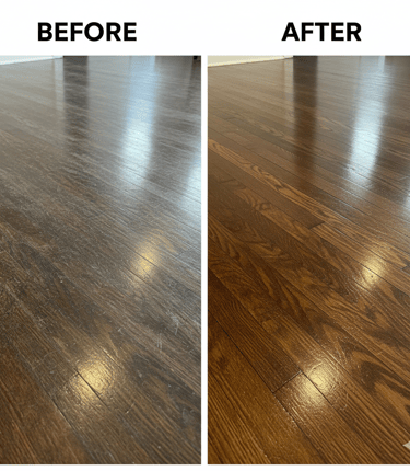 Our sand-less wood floor refinishing process restores the beauty of your floors without the dust, mess, or downtime of traditional sanding. This fast, cost-efficient, and dust-free method refreshes worn finishes, reduces surface scratches, and delivers long-lasting results—often completed in just one day.