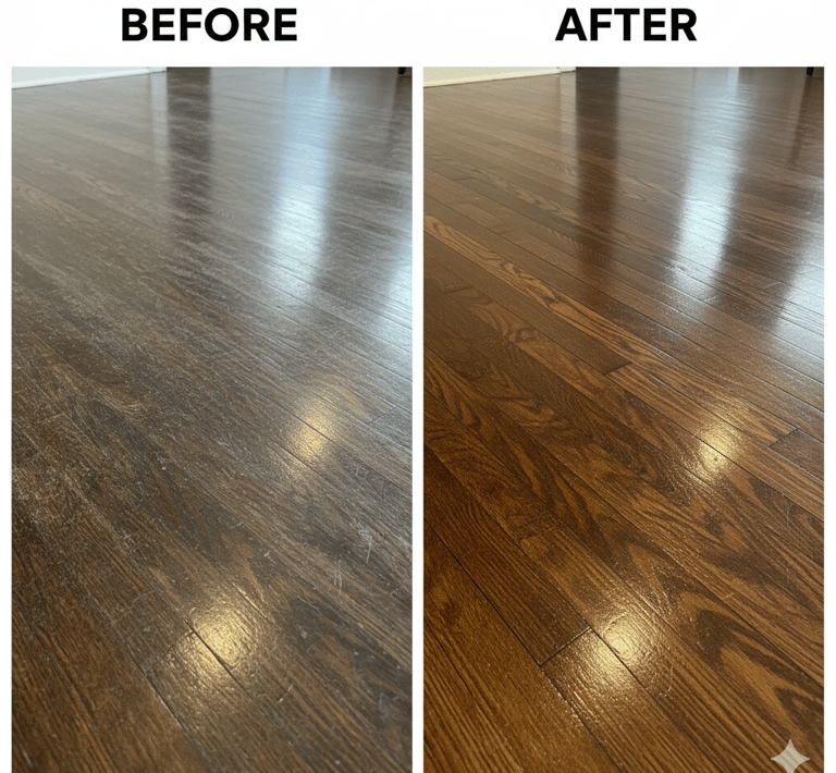 Our sand-less wood floor refinishing process restores the beauty of your floors without the dust, mess, or extended downtime of traditional sanding. Unlike conventional refinishing methods that create heavy dust, strong odors, and days of disruption, our advanced process is dust-free, low-odor, and often completed in just one day—allowing you to enjoy your space sooner.